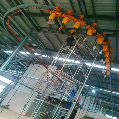 我们都知道钢丝绳电动葫芦、环链电动葫芦可以在环形、直行工字钢轨道上行走吊装作业。曲线运行小车可以帮助电动葫芦在环形轨道上转弯灵活,防脱轨。轨道较短,且只有1台或2台电动葫芦可以用电缆来供电,2台以上需要安装滑触线。电动葫芦拐弯跑车可以满足各种弯曲、弧形的运行工字钢轨道,采用的曲线电动葫芦跑车保证了电动葫芦拐弯时的良好通过性。对起吊重物、装卸工作、维修设备、吊运货物非常方便,适用各种悬空工字钢、曲线轨道、旋臂吊导轨及固定吊点上吊运重物。